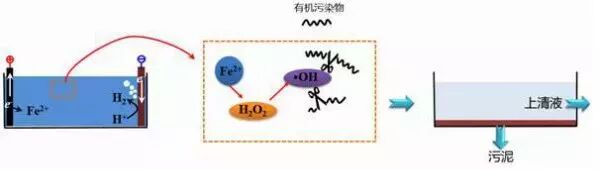 以金屬為溶解性陽極(一般為鋁或鐵),在電解時(shí)產(chǎn)生的Al3+或Fe3+離子生成電活性絮凝劑,來壓縮膠體雙電層使其脫穩(wěn),以及吸附架橋網(wǎng)捕作用來實(shí)現(xiàn)的: